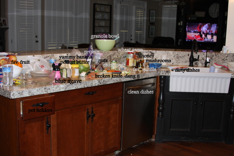 this is my huge cooking mess i decided to just do it all at once i guess i had stuff everywhere not a free surface in site even both ovens going yes i cooked while josh watched the basketball game